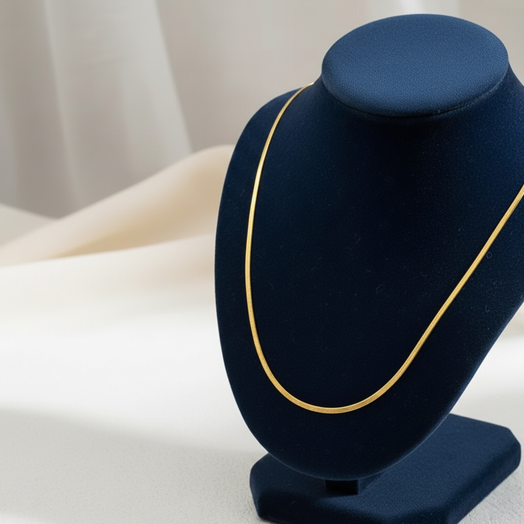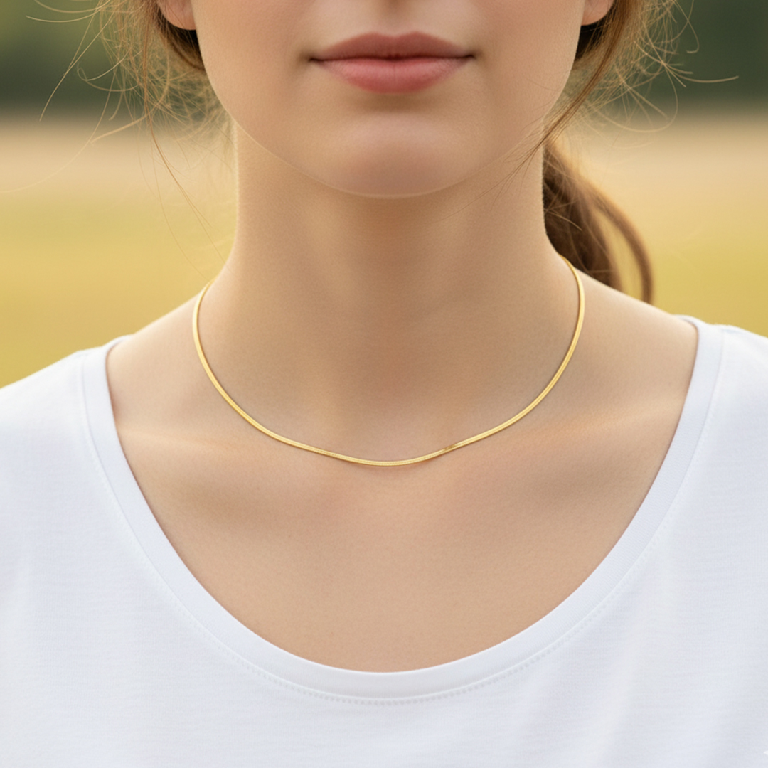 Elevate your jewellery collection with the Plain Flat Chain in a polished Gold Finish. This elegant flat chain necklace embodies minimalism and versatility, making it a must-have accessory for women who appreciate timeless style. Its sleek, flat design catches the light beautifully, adding subtle sophistication to both casual and formal outfits.