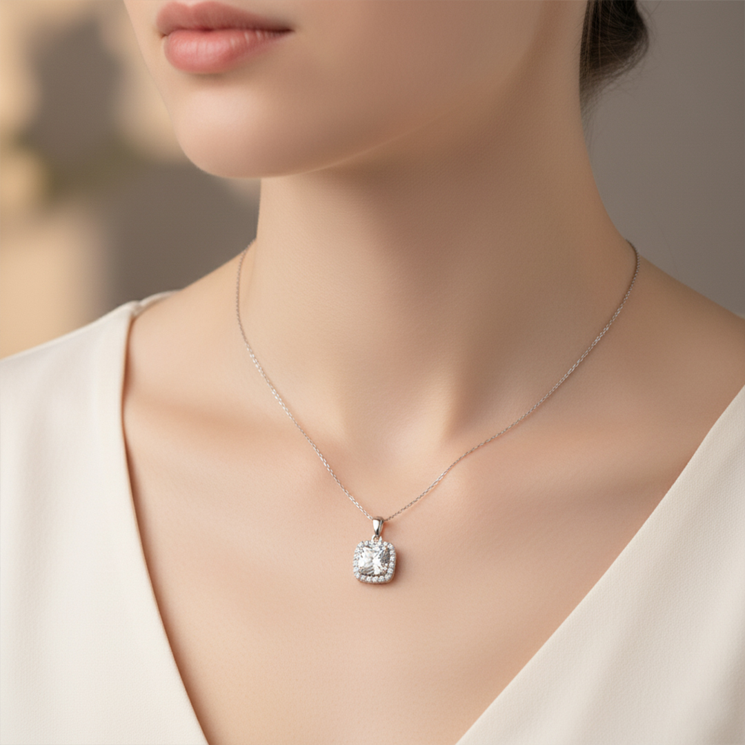 Add a touch of subtle sophistication to your everyday look with the Illusion Cushion Necklace in a radiant Silver Finish. Crafted from high-quality 925 Sterling Silver, this elegant necklace features a unique illusion cushion pendant that sparkles with a central clear zircon stone surrounded by delicate zircon accents. The sleek silver chain complements the pendant perfectly, creating a refined look that enhances both casual and formal outfits.