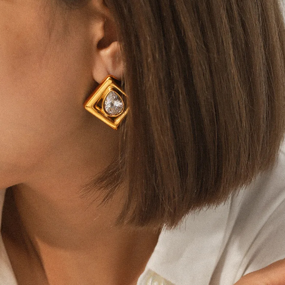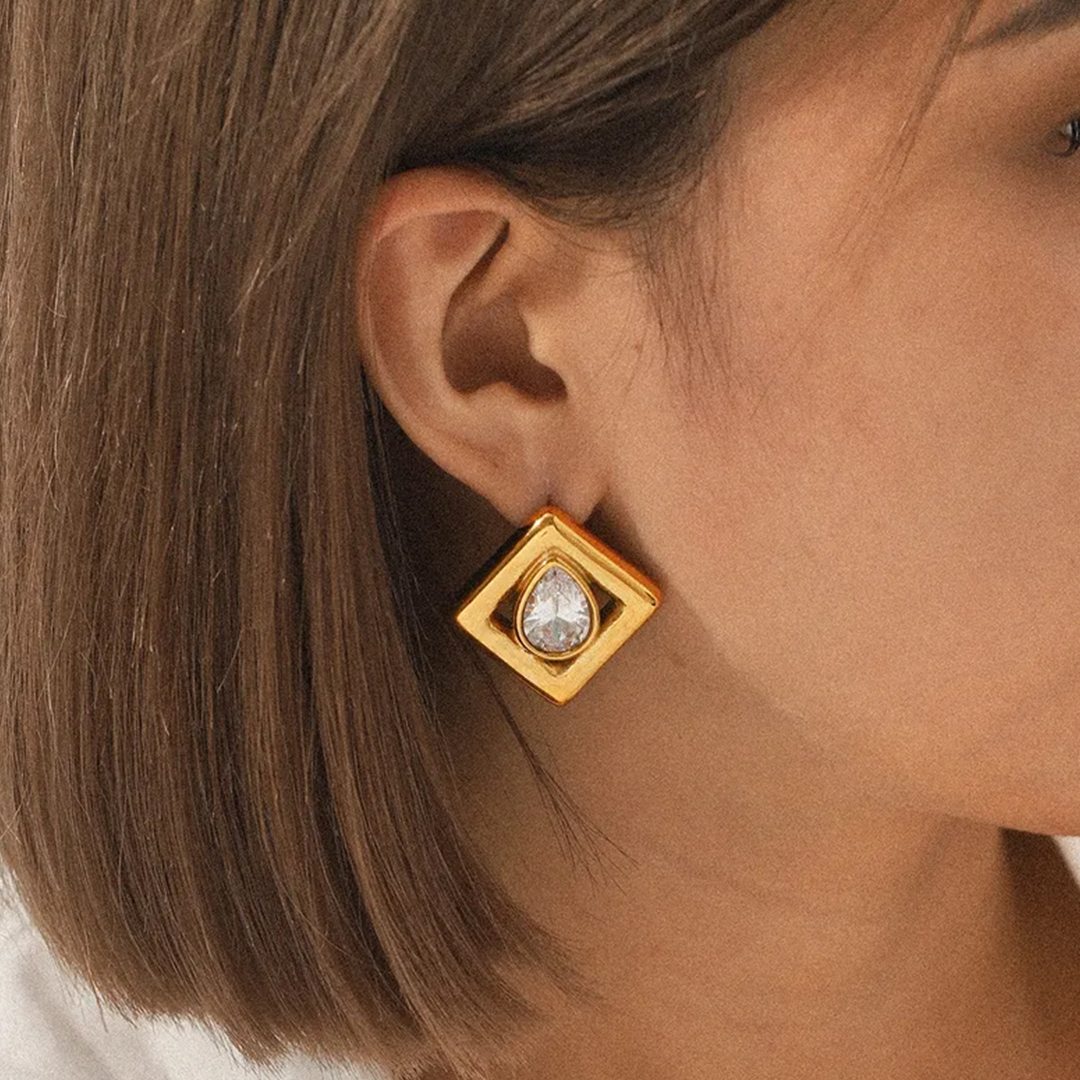 Add a touch of refined elegance to your collection with these Gold Diamond Square Earrings, crafted with a polished 18K Gold Plated finish. Featuring a sleek square design with a sparkling drop center zircon stone, these earrings combine geometric modernity with timeless sophistication. Perfect for both everyday wear and special occasions, they bring a subtle yet striking sparkle to any outfit.